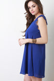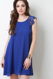 This mini dress features a round neckline, keyhole back with a single button closure, lace short sleeves, and straight hemline. Accessories sold separately. Made in U.S.A. 100% Polyester.
