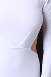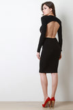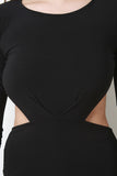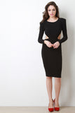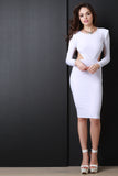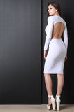 This sleek bodycon dress features a round neckline, long sleeves, backless and side cutout design. Finished with a sculpture fit and midi hemline. Accessories sold separately. Made in U.S.A. 96% Polyester, 4% Spandex.