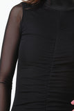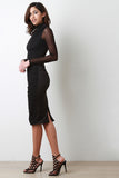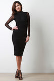 This bodycon dress features a semi-sheer mesh fabrication, stretchy silhouette fit, mock neckline, and long sleeves. Finished with gathered material in the front, zipper fastener at back and midi length hemline. Made in U.S.A. Accessories sold separately. 100% Polyester.