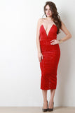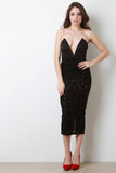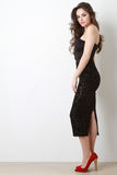 This strapless dress features velvet filigree texture knit fabric, semi-sheer design throughout bottom half, and sweetheart neckline with plunging v-shaped boning. Finished with a bodysuit under the top layer and small slit in the back. Accessories sold separately. Made in U.S.A. 95% Polyester, 5% Spandex.