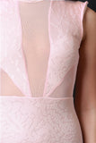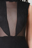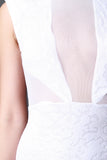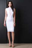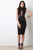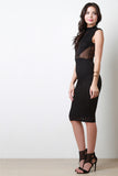 This midi dress features a mock neckline, sleeveless construction, open back cutout and double button closure at nape. Finished with a sculpture fit, and semi-sheer mesh fabrication. Accessories sold separately. Made in U.S.A. 9% Nylon, 10% Spandex.