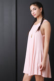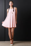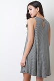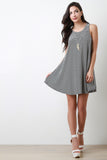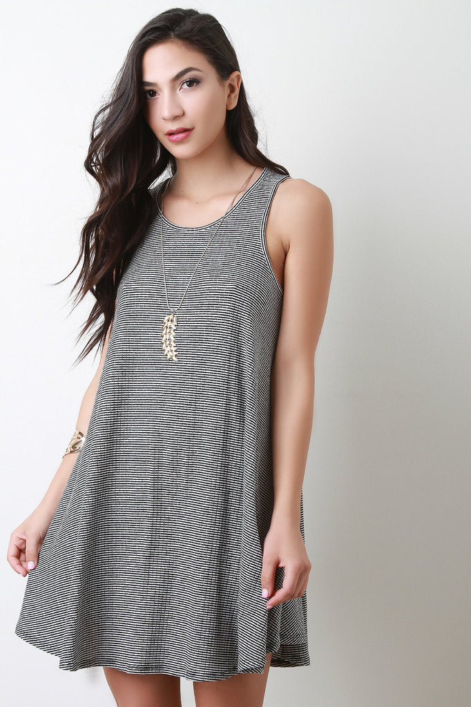 This cute flare dress features contrast stripes throughout, round neckline, pleated front accent and sleeveless construction. Finished with a keyhole cutout in the back and straight hemline. Accessories sold separately. Made in U.S.A. 47% Polyester, 47% Rayon, 6% Spandex.