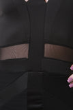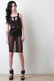 This bodycon dress features semi-sheer mesh fabrication, cutout design in the bodice area and sleeveless construction. Finished with an attached brief bottom and a midi hemline. Accessories sold separately. Made in U.S.A. 95% Polyester, 5% Spandex.