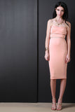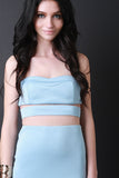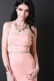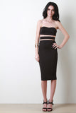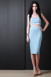This matching set features a tube top with hidden elasticized neckline, cutout design, crop hemline, and exposed back-zip closure. Partially lined. Matching midi skirt features a hidden elastic waistband, pencil cut, and midi-length hemline. Accessories sold separately. 95% Polyester, 5% Spandex.
