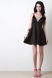 This beautiful dress features a plunging v-neck topped with a strappy open back, banded waistline, flatter skirt, and exposed back-zip closure. Accessories sold separately. Made in U.S.A. 96% Polyester, 4% Spandex.