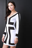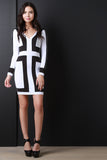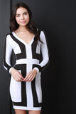 This colorblock dress features a v-neckline, long sleeves and a two tone color design. Finished with a sculpture fit and a mini hemline. Accessories sold separately. Made in U.S.A. 92% Polyester, 8% Spandex.