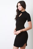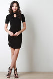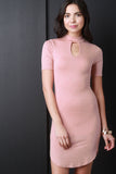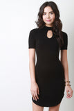 This mini dress features soft knit fabrication, mock neckline, and a keyhole shape opening on the chest section of the body. Finished with short sleeve construction and a rounded hemline. Accessories sold separately. Made in USA. 95% Rayon, 5% Spandex.