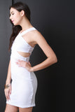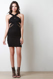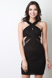 This dress features a crisscross neckline design, fishnet mesh, and sleeveless construction. Finished with waist cutouts and a back zipper fastener. Accessories sold separately. Made in U.S.A. 95% Polyester, 5% Spandex.