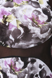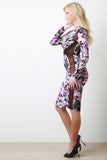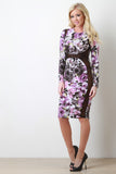 This bodycon dress features floral print with semi-sheer fabrication, a round neckline, and long sleeves. Finished with a stretchy sculpture fit and a midi hemline. Accessories sold separately. Made in U.S.A. 95% Polyester, 5% Spandex.