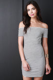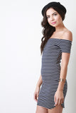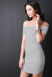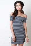 This bodycon dress features a horizontal stripe design, an elasticized off the shoulder neckline and short sleeves. Finished with a mini and round hemline. Accessories sold separately. Made in U.S.A. 65% Rayon, 30% Nylon, 5% Spandex.