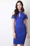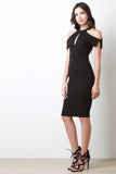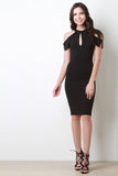 This bodycon midi dress features a textured knit, mock neckline with a keyhole cutout in the chest area and an open shoulder design. Finished with an open back design with a single button closure at nape. Accessories sold separately. Made in U.S.A. 96% Polyester, 4% Spandex.