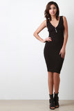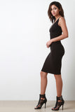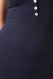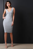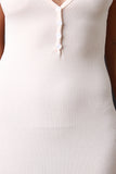 This sleeveless dress features a ribbed jersey fabrication in a curve-hugging fit, midi length, and button up v-neckline. Accessories sold separately. Made in U.S.A. 95% Rayon, 5% Spandex.