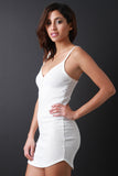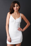 This mini dress features a ribbed knit fabrication, button up front, v-neckline with a spaghetti shoulder straps, and stretchy bodycon fit. Accessories sold separately. Made in U.S.A. 48% Rayon, 48% Polyester, 4% Spandex.