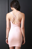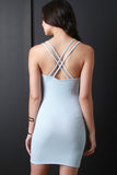 This bodycon dress features a ribbed knit fabrication, sleeveless, round neckline, double spaghetti shoulder straps to a crisscross back, sculpture fit, and mini length hemline. Accessories sold separately. Made in U.S.A. 48% Rayon, 48% Polyester, 4% Spandex.