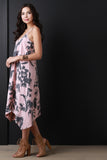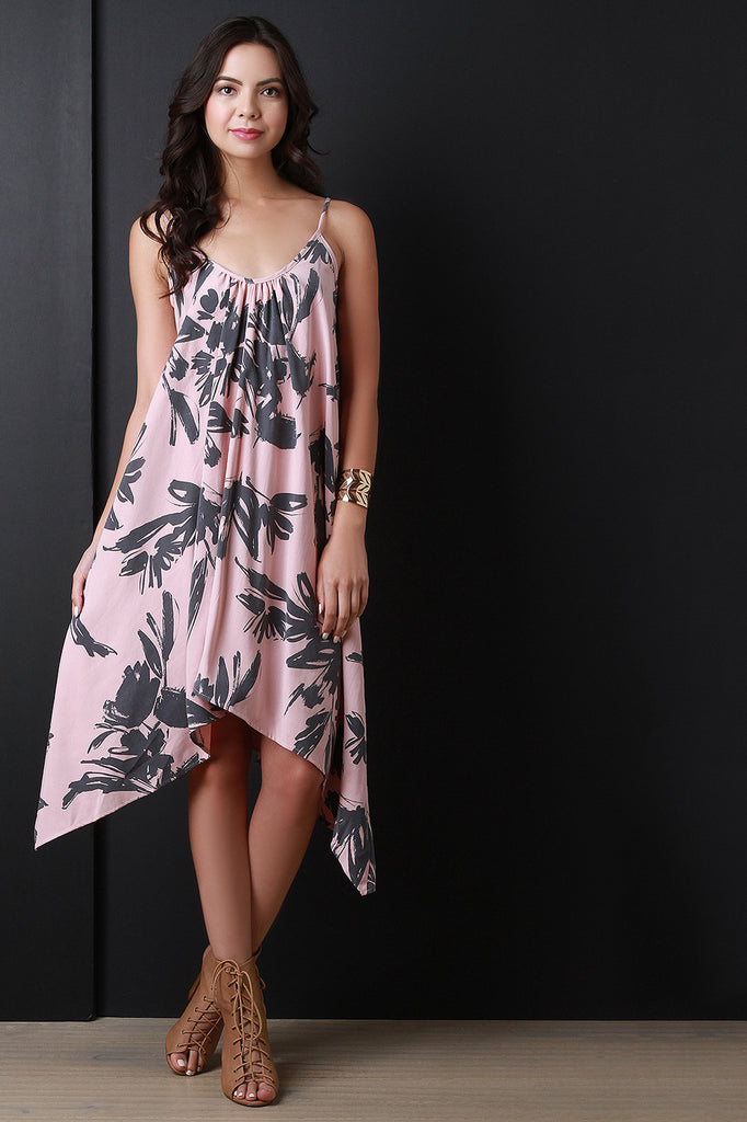 This dress features soft fabrication with a floral sketch design, wide deep v-neckline, adjustable spaghetti straps, relaxed fit, and finished with an asymmetrical hemline. Accessories sold separately. Made in U.S.A. 89% Modal, 11% Polyester.
