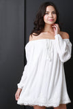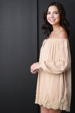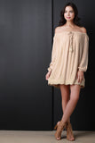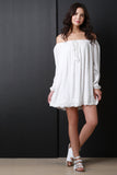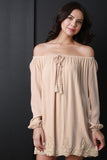This off-the-shoulder peasant dress features an elasticized ruffled neckline with a non adjustable tassel tie, long sleeves with elasticized cuffs.Finished with a relaxed fit and crochet designs on bottom of dress. Accessories sold separately. 100% Rayon.