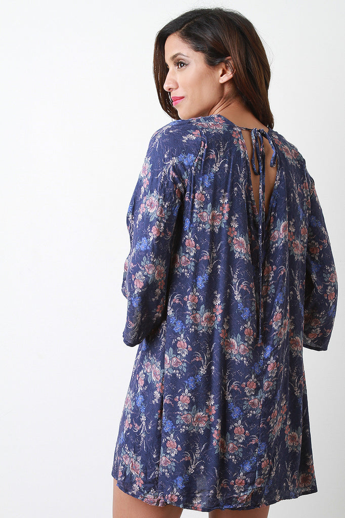 This shift dress features floral print jersey knit fabric, round neckline, long sleeves, keyhole cutout at back with self tie, and finished with lining. Accessories sold separately. Made in U.S.A. 100% Rayon.