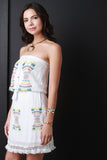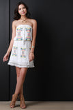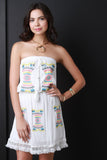 This strapless dress features an elastic neckline, tie with tassel and metal cap, embroidery detail on front, fringe hem detail, and elastic cinched waist. Accessories sold separately. Out Shell: 100% Rayon Lining: 100% Polyester.