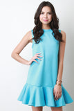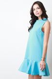 This mini dress features a round neckline, sleeveless construction, and finished with a peplum hemline. Accessories sold separately. 95% Polyester, 5% Spandex.