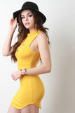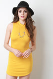 This casual mini dress features a jersey knit fabrication, mock neckline, and sleeveless construction. Finished with a curve hugging fit and rounded hemline. Accessories sold separately. Made in U.S.A. 96 % Rayon, 4% Spandex.