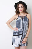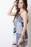This shift dress features a v neckline with a contrast cage inset detail, binding finish on neckline, adjustable spaghetti straps, light weight material, loose fit. Accessories sold separately. Self: 95% Polyester, 5% Spandex. Contrast: 100% Polyester
