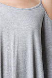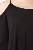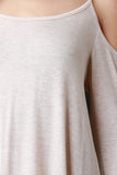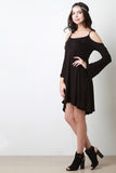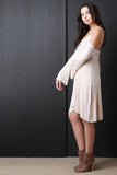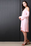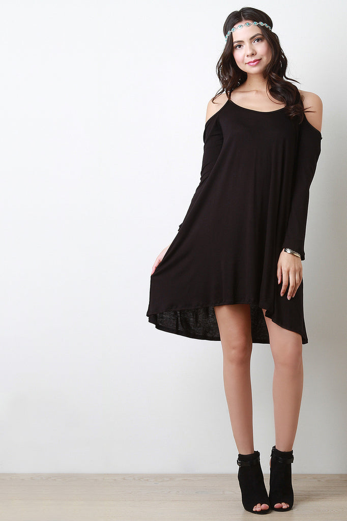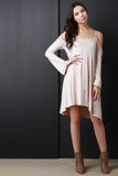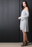 This casual dress features a jersey knit fabrication, scoop neckline with thin shoulder strap, cold shoulder, and bell long sleeves. Finished with a self tie drawstring at back and high-low hemline. Accessories sold separately. Made in U.S.A. 95% Rayon, 5% Spandex.