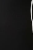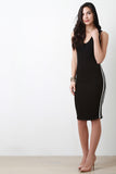 This sleeveless midi dress features a ribbed knit fabrication, v-neckline with attached hood, contrasting striped detail along side, stretchy sculpture fit, and midi-length hem. Accessories sold separately. Made in U.S.A. 95% Rayon, 5% Spandex.