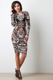 This bodycon dress features an abstract pattern print on semi-sheer mesh fabrication, with a contrast solid black back, round neckline, long sleeves, and stretchy sculpture fit. Accessories sold separately. Made in U.S.A. 100% Polyester.