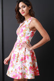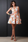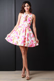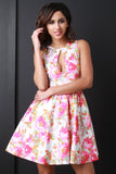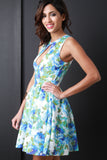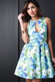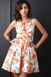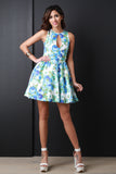 This sleeveless dress features high neckline, front keyhole detail, high waist seam, gathered skater flare skirt, sleeveless, front button closure, built in petticoat, knit fabrication and fully lined. Made in U.S.A. Accessories sold separately. 95% Polyester, 5% Spandex.