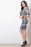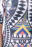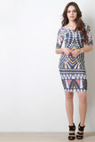 This dress features an intricate tribal print throughout, semi-sheer fabrication, curve hugging, scoop neckline, and quarter sleeves construction. Accessories sold separately. Made in U.S.A. 95% Polyester, 5% Spandex.