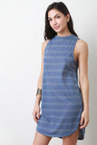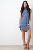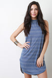 This dress features a mock neckline, horizontal dots detail, soft knit fabrication, and sleeveless construction. Finished with a round hemline. Accessories sold separately. Made in U.S.A. 69% Polyester, 31 % Polyester.