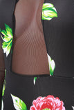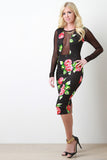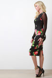 This bodycon dress features a round neckline with semi-sheer mesh panel at center, long mesh sleeves, high waisted cinched seam, sculpture fit, zipper fastener at back, and rose print design. Accessories sold separately. Made in U.S.A. 95% Rayon, 5% Spandex.