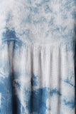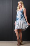 This dress features a tie dye print throughout, flowy knit fabrication, scoop neckline and back, sleeveless construction and slightly ruffled mid design. Accessories sold separately. Made in U.S.A. 100% Rayon.