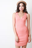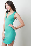 This casual dress features soft rib knit jersey, v-neckline, racer back, subtle side slits, and curved hem. Accessories sold separately. Made in U.S.A. 48% Rayon, 48% Polyester, 4% Spandex.