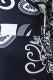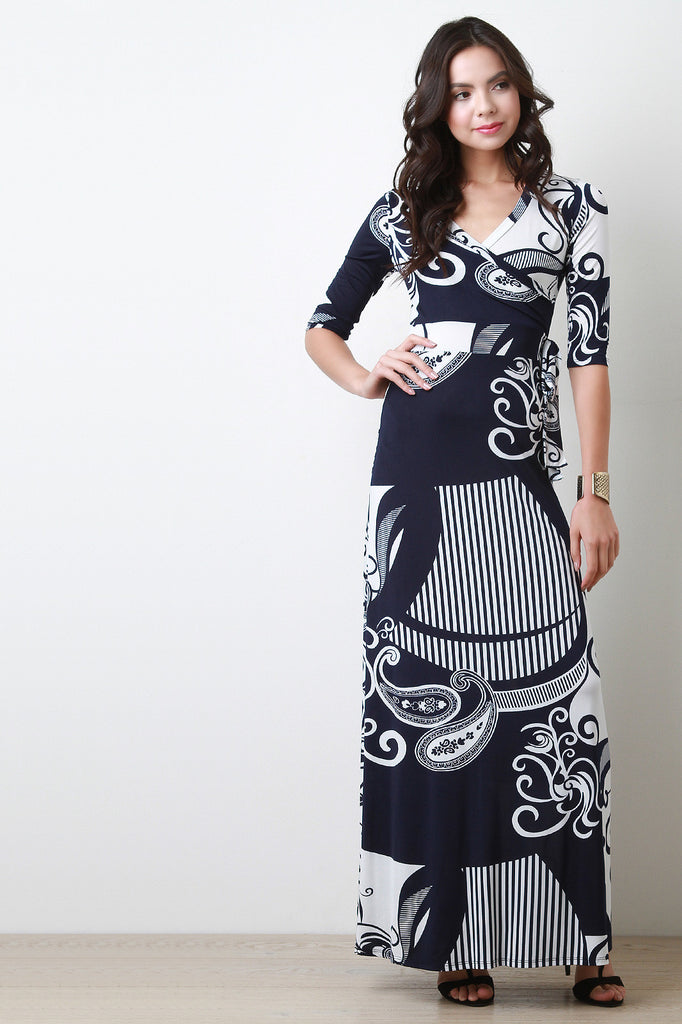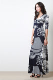 This boho inspired maxi dress features a surplice neckline, half sleeves, soft knit fabrication, slight flare skirt, maxi hem line, tie at waist and a large paisley/filigree print. Accessories sold separately. Made in U.S.A. 95% Polyester 5% Spandex.