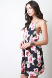 This chic skater dress features a stretchy charmeuse fabrication, floral print throughout, spaghetti straps, and open back construction. Finished with a hidden rear zip-up closure and flare skirt. Accessories sold separately. Made in U.S.A. 95% Polyester, 5% Spandex.