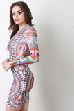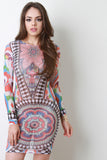 This semi-sheer mesh bodycon dress features a round neckline, long sleeves, sculpture fit, and abstract floral pattern print throughout. Accessories sold separately. Made in U.S.A. 95% Polyester, 5% Spandex.