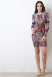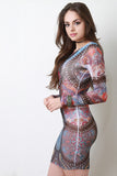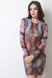 This semi-sheer mesh bodycon dress features a round neckline, long sleeves, sculpture fit, and abstract medallion pattern print throughout. Accessories sold separately. Made in U.S.A. 95% Polyester, 5% Spandex.