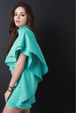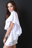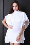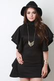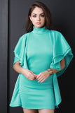 This elegant dress features a mock neck, back keyhole cutout design with double buttons closure at nape, ruffle sleeves along sides, and stretchy sculpture fit. Accessories sold separately. Made in U.S.A. 95% Polyester, 5% Spandex.