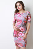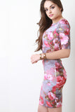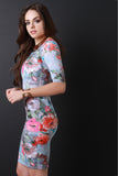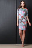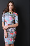 This bodycon dress features a square neckline, half sleeves, a techno floral print, body con fit, knit fabrication, midi hemline, and a center back invisible zipper closure. Accessories sold separately. Made in U.S.A. 95% Polyester, 5% Spandex.