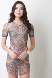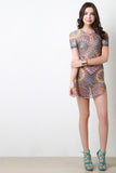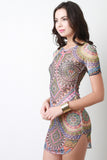 This dress features circle abstract pattern print on semi-sheer mesh fabrication, round neckline, short sleeves, and a rounded hemline. Accessories sold separately. Made in U.S.A. 95% Polyester, 5% Spandex.
