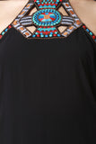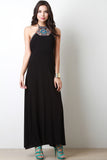 This sleeveless maxi dress features a halter neckline with colorful embroidery and beadwork design, zipper back, and left vent slit. Accessories sold separately.