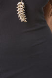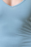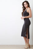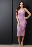 This casual chic dress features a deep v-neckline, sleeveless, spaghetti shoulder straps, sculpturing ribbed knit fabrication, midi length hemline, and left vent slit. Accessories sold separately. Made in U.S.A. 65% Modal, 35 % Polyester.
