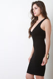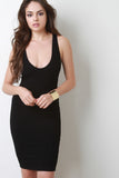 This bodycon dress features a deep V neckline, racerback design, sleeveless, midi hemline, self lined, stretchy sculpture silhouette, and ribbed knit fabrication. Made in U.S.A. 95% Rayon, 5% Spandex.