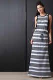 This maxi dress features a round neckline, sleeveless cutout sides with a contrasting crop underlay, drop waist drawstring tie, side vent slits, and horizontal stripes print. Accessories sold separately. 94% Rayon, 6% Spandex. Lining: 100% Rayon.