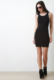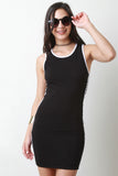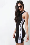 This mini dress features a sleeveless design, round neckline, knit fabrication with contrast side panels with "Love" printed down the panel. Finished with a stretchy sculpture fit. Accessories sold separately. Made in U.S.A. 95% Cotton, 5% Spandex. Contrast: 95% Polyester, 5% Spandex.