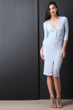 This ribbed knit dress features 3-button up half-placket construction, v-neckline, quarter-length sleeves, high waisted cinched seam, and vent slit front. Accessories sold separately. Made in U.S.A. 60% Rayon, 37% Polyester, 3% Spandex.