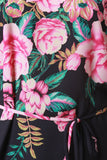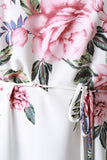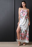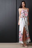 This alluring sleeveless maxi dress features a stretchy fabrication with floral print throughout, square neck, self-tie drawstring at waist, and a thigh high slit at side. Accessories sold separately. Made in U.S.A. 100% Polyester.