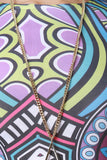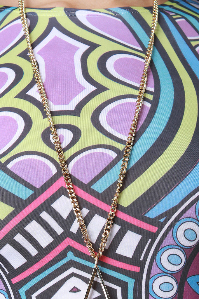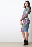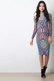 This dress features a soft knit fabrication with contrasting long mesh sleeves, abstract tribal mirror print, round neckline, and midi-length hemline. Accessories sold separately. Made in U.S.A. 92% Polyester, 8% Spandex.