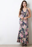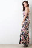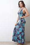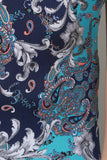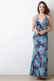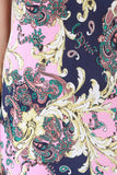 This maxi dress features baroque paisley pattern, v-neckline, sleeveless construction, and lace-up back. Accessories sold separately. Made in U.S.A. 92% Polyester, 8% Spandex.